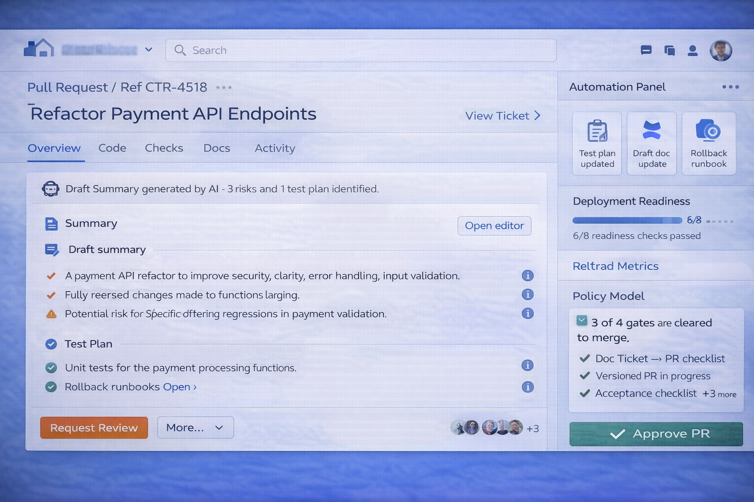 | PR → Doc update PR | Suggests Confluence/doc changes as a versioned PR. | Docs only updated via reviewable changes. |