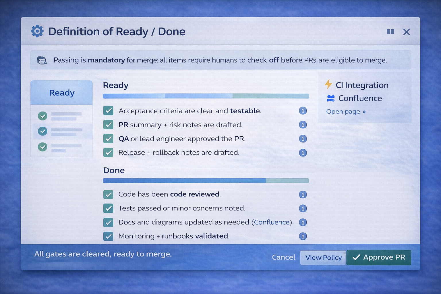 - “Definition of Ready/Done” enforcement with checklists.