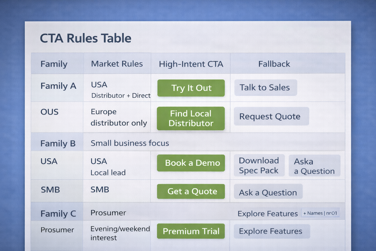 Implemented conversion pathways and nurturing loops across a global product catalog: smarter CTAs, intent-based segmentation, sales-ready handoff, and measurable experimentation — built to scale across markets without fragmenting UX or tracking.